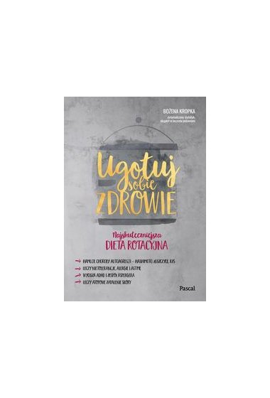 Co 72 godziny jesz ściśle określone produkty! Przygotowanie posiłków na cały dzień zajmuje tylko około godzinę! Efekty widoczne już po 30 dniach! Największym wyzwaniem w walce z chorobami XXI wieku jest zastosowanie wiedzy teoretycznej w tworzeniu konkretnych dań. Co jeść? Kiedy? Jak często? To pytania, które zadają sobie osoby cierpiące na alergie, choroby z autoagresji (np. stwardnienie rozsiane, zespół przewlekłego zmęczenia, choroba Hashimoto, bielactwo, łuszczyca, reumatoidalne zapalenie stawów, cukrzyca insulinozależna), choroby grzybicze, chorzy po zabiegach onkologicznych, z czasową nietolerancją pokarmową, rodzice dzieci autystycznych. Idealnym sposobem na pozbycie się wielu dolegliwości i wyciszenie organizmu jest unikatowa dieta rotacyjna według programu 6 kroków wyjścia z alergii. Bożena Kropka, dyplomowany dietetyk i promotor zdrowia, jako pierwsza w Polsce wprowadziła zalecenia diety rotacyjnej 3B: • bez glutenu • bez cukru • bez mleka Już dzisiaj rozpocznij swój program powrotu do zdrowia!