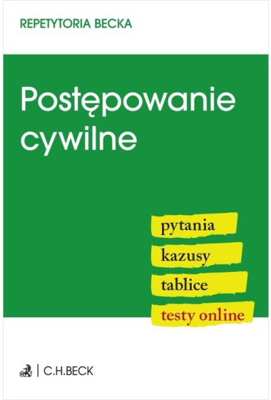 Repetytorium prezentuje i porządkuje najważniejsze zagadnienia z zakresu postępowania cywilnego. Dzięki tej publikacji sprawnie przyswoisz wiedzę, poznasz podstawy najważniejszych zagadnień, a na koniec sprawdzisz i uzupełnisz ewentualne braki w przygotowaniu do egzaminu. Zagadnienia zostały opracowane przez specjalistów i szkoleniowców. Stan prawny: 1 grudnia 2023 r., z uwzględnieniem zmian późniejszych wchodzących w życie do 25 marca 2024 r. (Dz.U. z 2020 r. poz. 2320 oraz z 2023 r. poz. 556, 1429, 1606, 1860). Repetytorium składa się z czterech części: PYTANIA Z ODPOWIEDZIAMI – zawierające niezbędne informacje z danej dziedziny prawa oraz odpowiedzi z właściwą podstawą prawną oraz odesłaniem do konkretnego artykułu. KAZUSY Z ROZWIĄZANIAMI – oparte na aktualnym stanie prawnym i przykładowym orzecznictwie, uczące prawniczego myślenia. TABLICE – czytelnie prezentujące zagadnienia i ułatwiające wzrokowe zapamiętanie haseł i definicji. TESTY ONLINE – sprawdzające poziom przygotowania z danej tematyki. Zagadnienia zawarte w książce dotyczą m.in.: Pojęcia, rodzajów i źródeł prawa procesowego cywilnego, Zasad i przesłanek postępowania cywilnego, Podmiotów postępowania, Kosztów procesu, Czynności procesowych, Przebiegu postępowania przed sądem I instancji, Środków zaskarżenia, Postępowań odrębnych, Postępowań w sprawach z zakresu prawa rzeczowego, Jurysdykcji krajowej, Uznania i wykonanie orzeczeń sądów państw obcych. Książka zawiera: Praktyczne pomoce w formie pytań i kazusów. Przejrzystą prezentację treści w formie tablic i schematów. Roczny dostęp do testów online. Szybko i skutecznie przygotuj się do egzaminu!