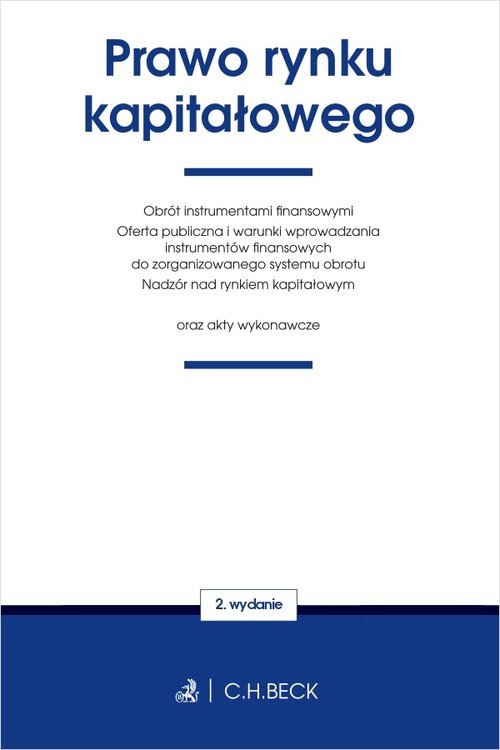 Książka zawiera: Ustawę o obrocie instrumentami finansowymi, Ustawę o ofercie publicznej i warunkach wprowadzania instrumentów finansowych do zorganizowanego systemu obrotu oraz o spółkach publicznych, Ustawę o nadzorze nad rynkiem kapitałowym, 23 rozporządzenia. Książka adresowana jest do prawników oraz studentów prawa, dla których znajomość obowiązujących przepisów stanowi warunek prawidłowego wykonywania zawodu. Kolejne wydania publikacji uwzględniają najnowsze zmiany, przez co zapewniają bieżącą znajomość prawa. Seria Teksty Ustaw Becka to: Aktualny stan prawny Czytelne hasła i tekst Przypisy od Redakcji Wyróżnienie najnowszych zmian Wybór aktów prawnych Indeks rzeczowy